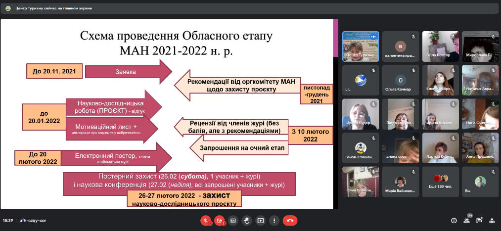 1 лютого 2022 року відбувся черговий обласний семінар-нарада «Особливості проведення обласного етапу Всеукраїнського конкурсу-захисту науково-дослідницьких робіт МАН у 2022 році» з використанням інтернет ресурсів Google meet, організатором якого був комунальний заклад «Запорізький обласний центр туризму і краєзнавства, спорту та екскурсій учнівської молоді» Запорізької обласної ради.