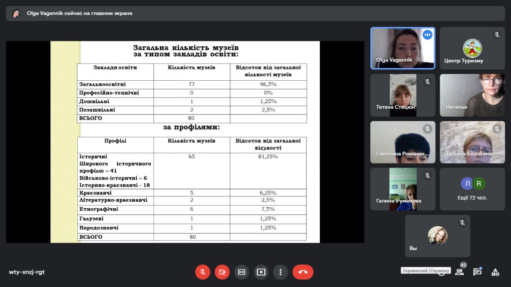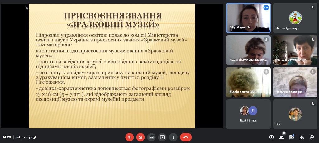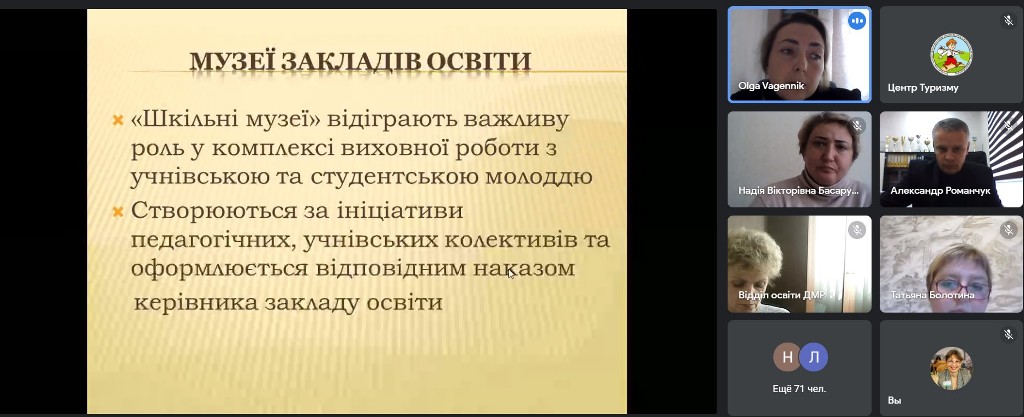 Далі, згідно програми семінару, методистка відділу краєзнавства та патріотичного виховання КЗ «Центр туризму» ЗОР Ольга Новаковська ознайомила учасників із особливостями проведення Всеукраїнського огляду музеїв при закладах освіти у 2021-2022 н.р., умовами і порядком присвоєння звання «Зразковий музей» та акцентувала увагу на питанні «Дотримання державної політики у сфері діяльності музеїв історичного профілю при закладах освіти».