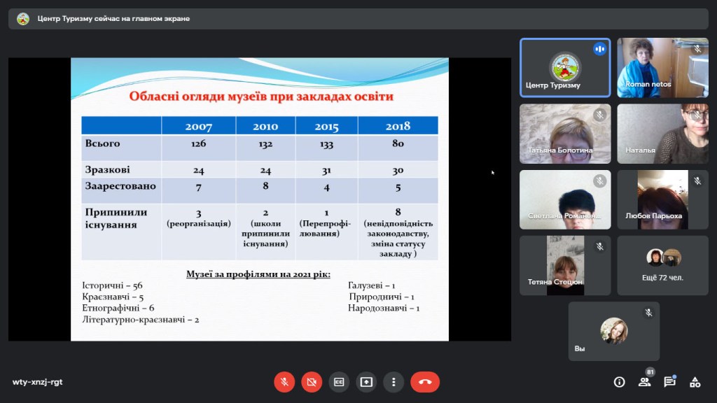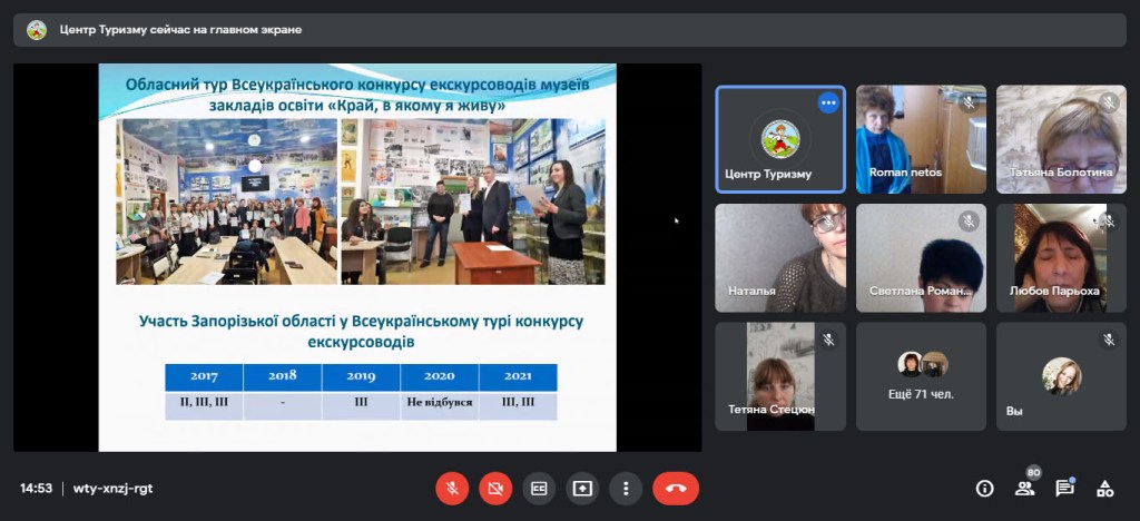 27 жовтня 2021 року відділом краєзнавства та патріотичного виховання комунального закладу «Запорізький обласний центр туризму і краєзнавства, спорту та екскурсій учнівської молоді» Запорізької обласної ради було проведено обласний семінар-нараду щодо Всеукраїнського огляду музеїв при закладах освіти та Всеукраїнського конкурсу екскурсоводів, який пройшов в онлайн-форматі на платформі «Google Meеt».