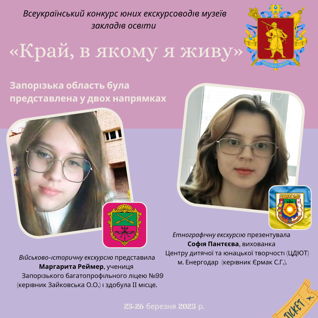 Вітаємо юних екскурсоводів Запорізької області, які 25-26 березня 2025 року презентували віртуальні екскурсії музеями закладів освіти м. Запоріжжя та Енергодара. Традиційно щорічний конкурс юних екскурсоводів музеїв закладів освіти «Край, в якому я живу» є важливою подією у музейному просторі України, адже до заходу долучилися учасники з 21 області та м. Києва. Проводячи змістовні екскурсії, юні екскурсоводи знайомили відвідувачів музеїв з історією, культурою та видатними особистостями рідного краю. Наші учасниці показали високий рівень підготовки та володіння матеріалом, здобувши новий досвід та цікаві ідеї для своїх екскурсій!