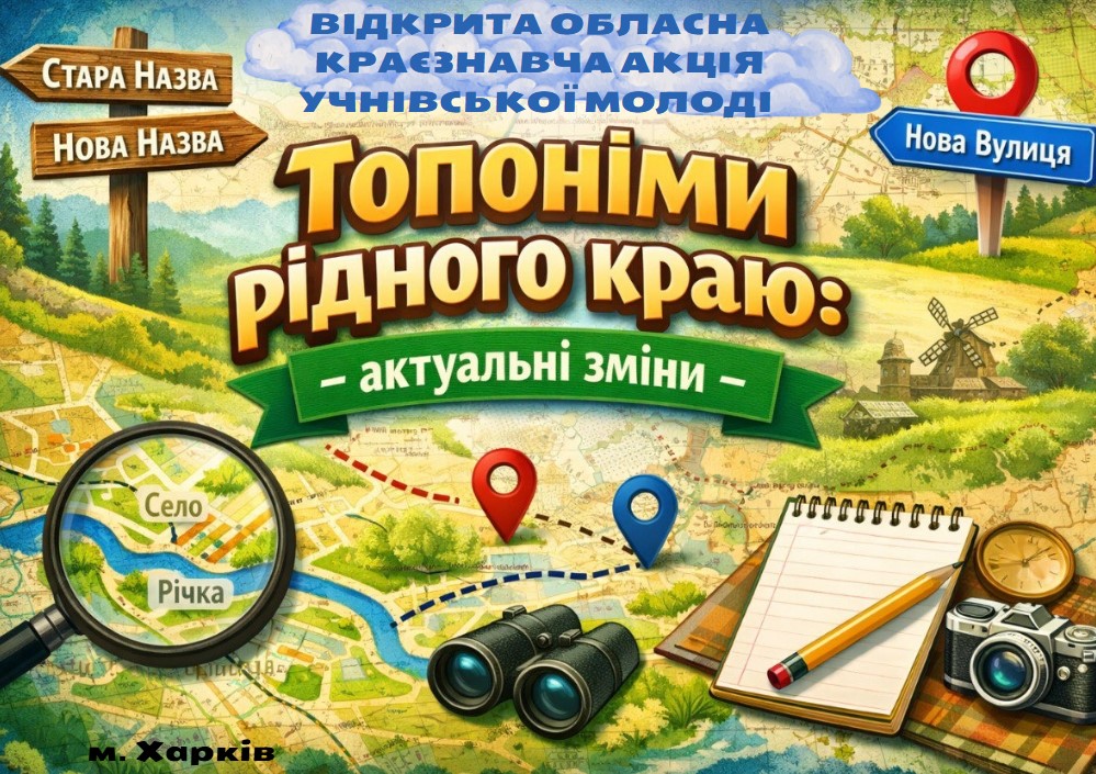 Комунальний заклад «Харківський обласний центр туризму, краєзнавства, спорту та екскурсій учнівської молоді» Харківської обласної ради запрошує здобувачів освіти, вихованців закладів загальної середньої та позашкільної освіти України до участі у відкритій обласній краєзнавчій акції учнівської молоді «Топоніми рідного краю: актуальні зміни».