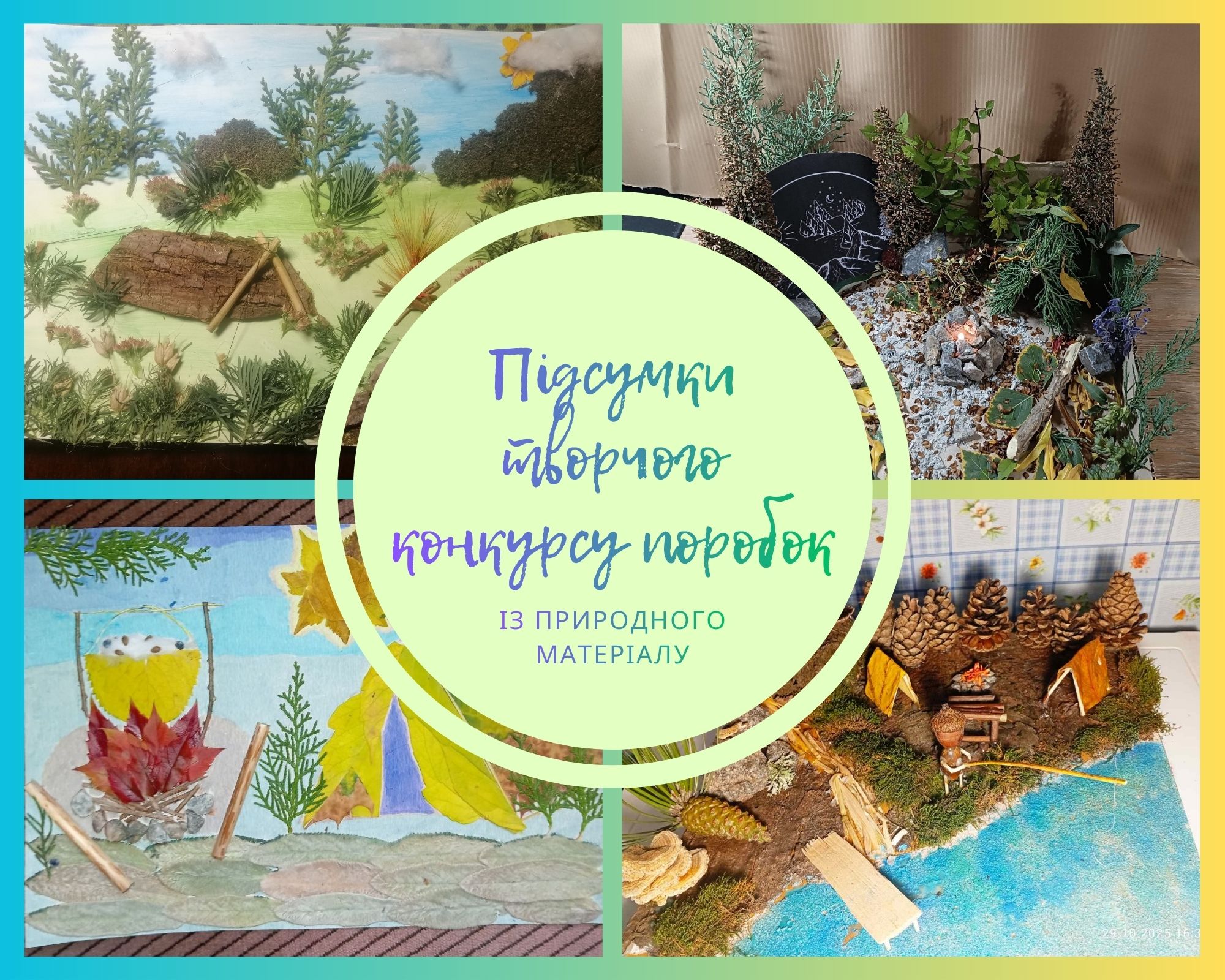 В КЗ «Центр туризму» ЗОР завершилось суддівство творчого конкурсу поробок із природного матеріалу серед учнівської молоді Запорізької області. На конкурс було представлено 72 роботи виконані в техніці аплікація (молодша вікова групи) та техніці торцювання (старша вікова група).